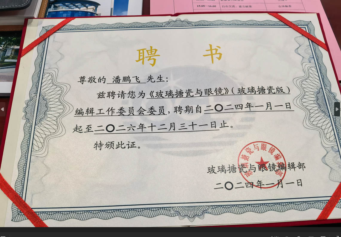 2024年4月,中邦董事長潘鵬飛被國家級學術期刊《玻璃搪瓷與眼鏡》聘為編委,主要負責靜電搪瓷有關論文稿件的